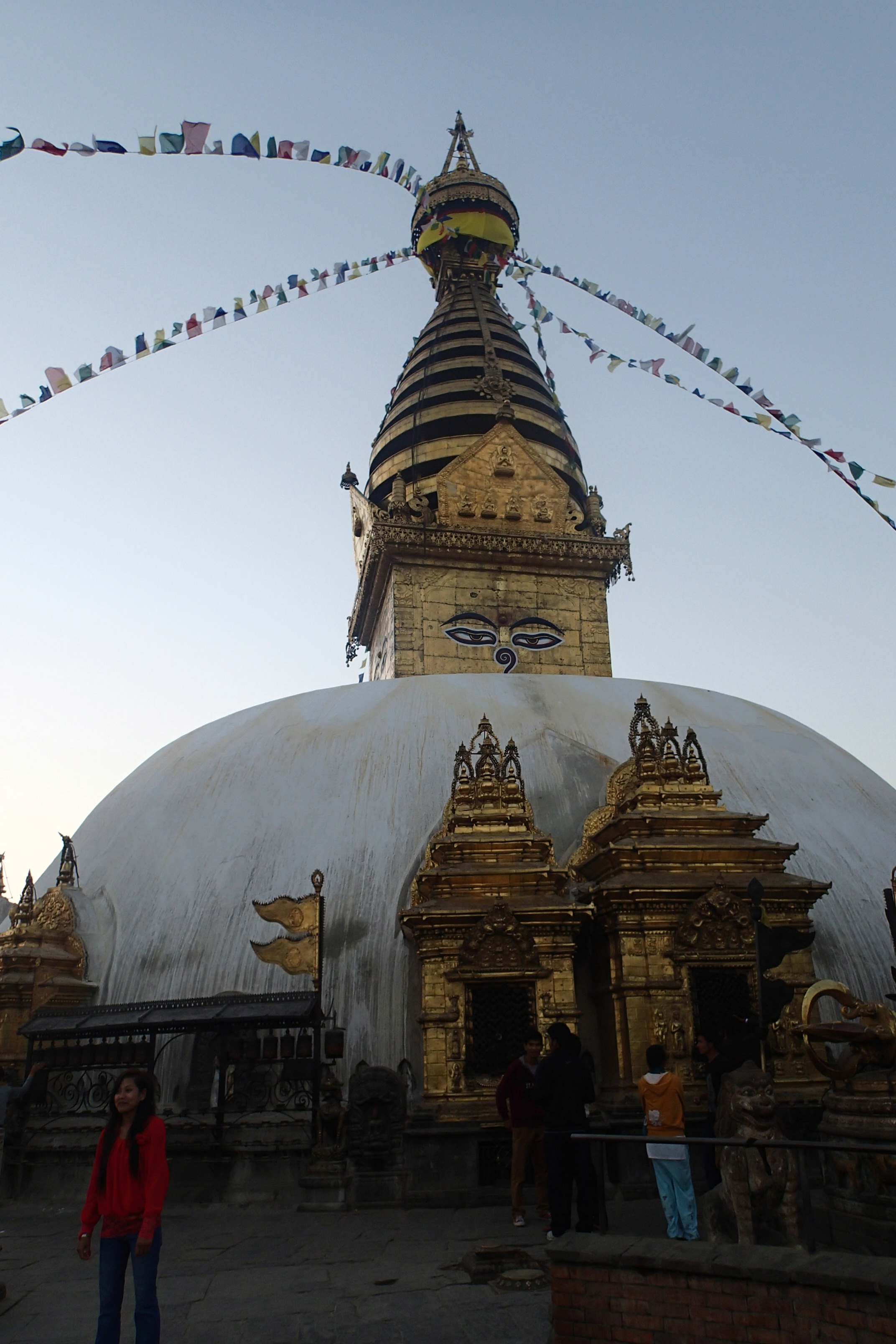 After dinner we bumbled around lost, looking for the Monkey Temple as the sun was setting. Unsure of Kathmandu’s nighttime safety I must admit I was a little on edge. The no streetlights thing kinda got to me. Gabe, enthusiastic as ever, pressed on, dragging me with him. But it was totally worth it, despite the giant stairs to the top. All of the temples here are amazing and monks still reside in most of them. The sparkle of gold and the flap of prayer flags invited us in at the top and we were treated to a spectacular view of Kathmandu. The valley looked beautiful in front of a backdrop of snow-capped mountains and a golden sunset. Sublime.